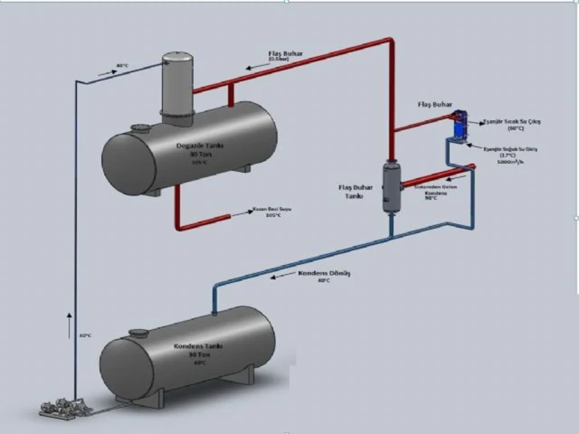 Kondens Tahliyesindeki Kayıp Isıyı Sisteme Kazandıran Yüksek Verimli Çözüm. Flaş buhar tanklarımız, ısıtma sisteminden dönen yüksek basınçlı kondensin basıncını 0,5 bar(g) seviyesine düşürerek, bu basınç farkından doğan "flaş buharı" ekonomiye kazandırmak üzere tasarlanmıştır. Elde edilen bu değerli enerji, özellikle degazör ısıtmasında kullanılarak yakıt tasarrufu sağlar. Mühendislik hesaplamalarıyla optimize edilen tank çapı ve çıkış hızları sayesinde, türbülanssız ve su zerreciklerinden arındırılmış yüksek kaliteli buhar ayrışımı garanti edilir.